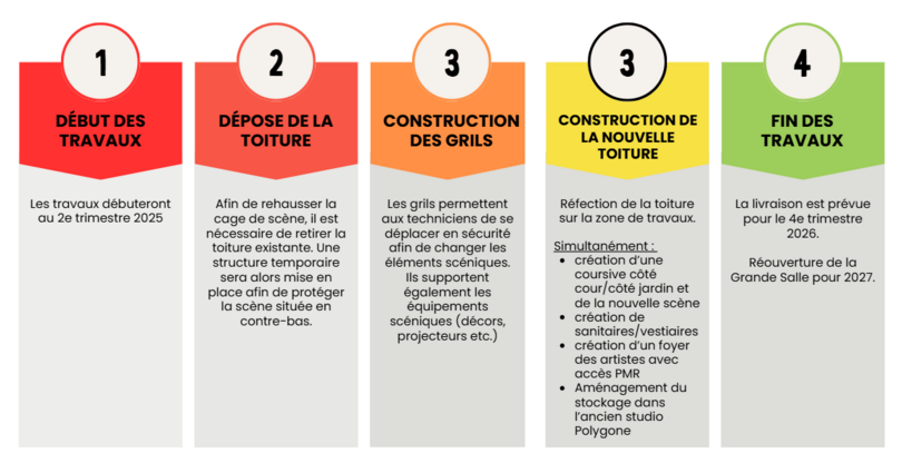 Afin de rénover et améliorer la cage de scène, les travaux permettront la mise en place de structures. Ainsi les techniciens pourront travailler en parfaite sécurité, et installer les éléments scéniques (projecteurs, décors...).
