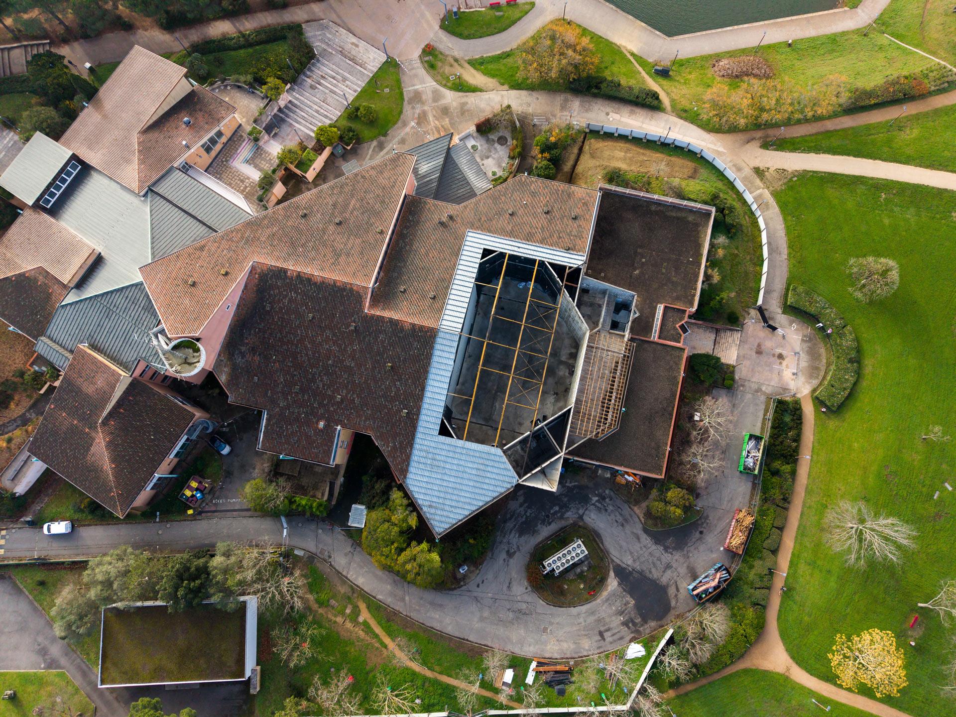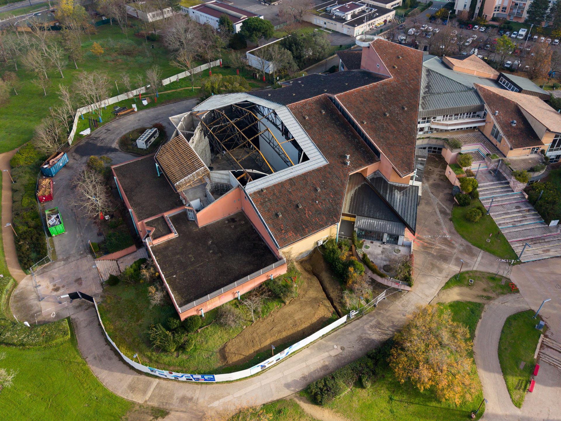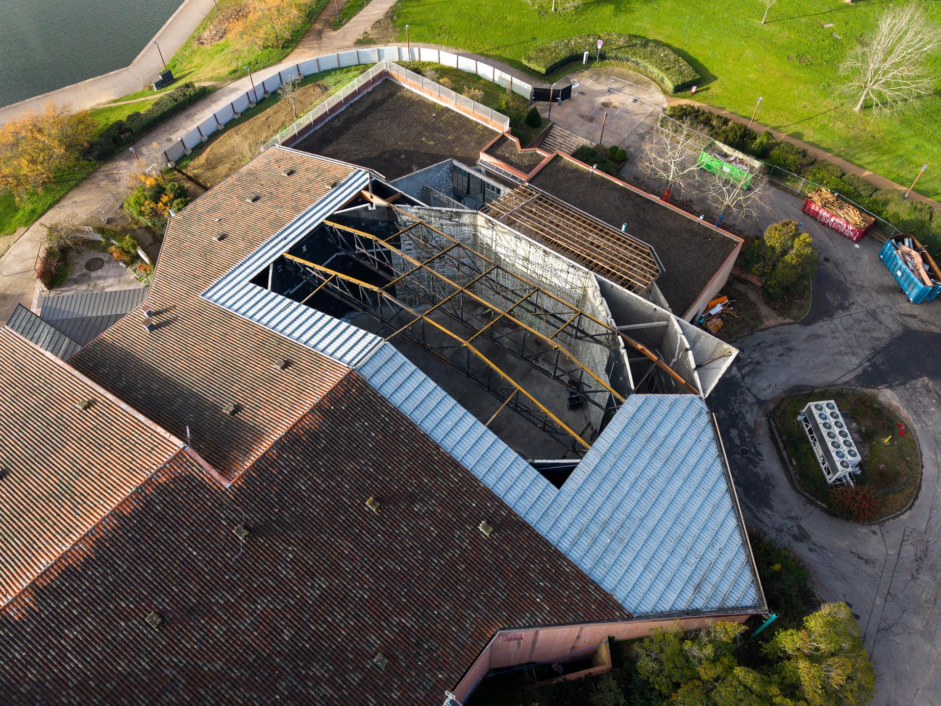 Afin de rehausser la cage de scène, il est nécessaire de retirer la toiture existante. Le démontage de la toiture a débuté au mois de novembre. Cette étape consiste à enlever une partie qui compose la toiture, à savoir la couverture, le système d’isolation extérieure ou intérieure, une partie de la charpente. Une structure temporaire est mise en place afin de protéger la scène située en contre-bas.